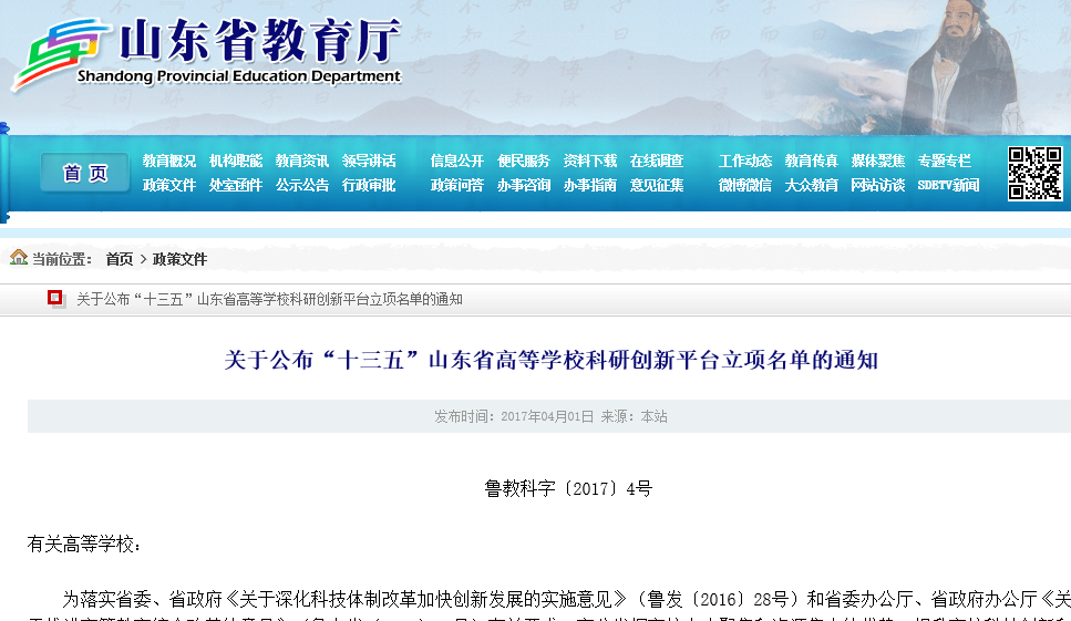 近日,山东省教育厅公布了“十三五”山东省高等学校科研创新平台立项名单,我院申报的山东省高等学校重点实验室“航空信息与控制实验室”获批立项建设。