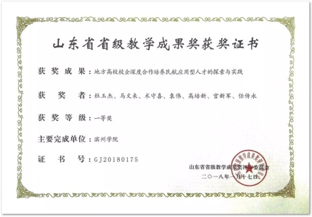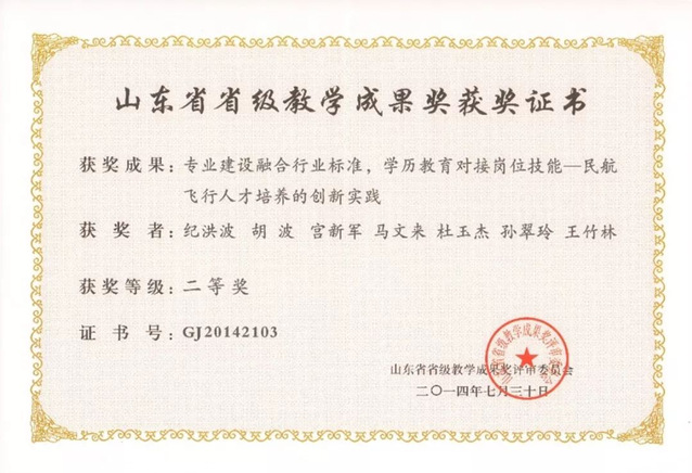 飞行技术专业被评为国家级综合改革试点专业、山东省一流本科专业、山东省特色专业、山东省卓越工程师教育培养计划试点专业,飞行专业群获批为山东省高水平应用型专业群,山东省民用航空技术应用型人才培养模式创新实验区被评为山东省高等学校人才培养模式创新实验区,立项国家级第二批新工科研究与实践项目1项,建有1门国家级一流本科课程,承担质量工程项目国家级2项、省部级14项,出版教材17部。先后与山东航空股份有限公司等22家航空公司和国内外20家航校联合培养飞行员2600余名,已有500余人晋升为机长,为社会培养机务维修人员、签派人员、空管人员600余名,校企合作成果成功入选2020年中国高等教育博览会全国“校企合作 双百计划”典型案例。教学成果获山东省高等教育优秀教学成果一等奖1项、二等奖1项、中国自动化学会高等教育优秀教学成果二等奖1项。