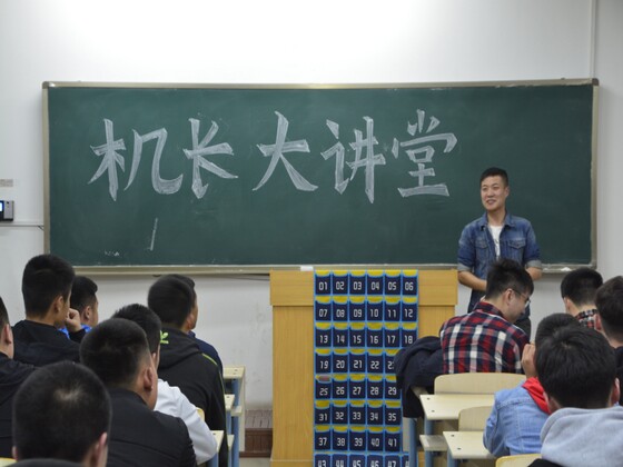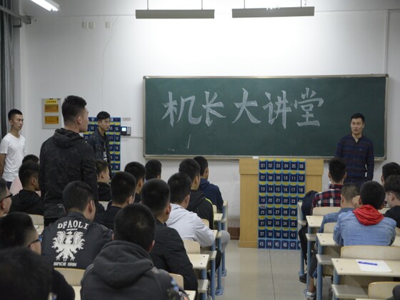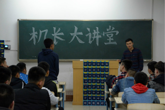 299365上市公司“飞向云端——机长大讲堂”第三场主题讲演由2013级山东航空公司以及中国邮政航空公司八名飞行员进行联合主讲,2017级飞行学员聆听报告。