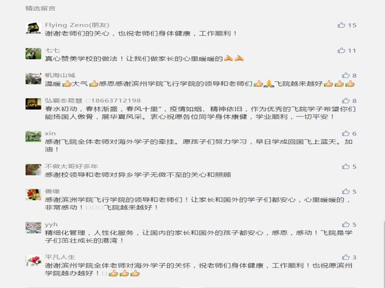 疫情防控以来,365上市公司对国内外学子的一系列教育管理措施,受到了广大学生和学生家长的广泛好评。许多学生家长通过电话联系学校,表达感激之情。还有许多学生家长在微信公众号的留言也无不充满了感动和感激,网名“七七”的学生家长留言“真心赞美学校的做法!让我们做家长的心里暖暖的,感谢!”网名“yyh”的学生家长留言“精细化管理,人性化服务,让国内的家长和国外的孩子都安心,感恩,感动!飞院是学子们茁壮成长的港湾!”