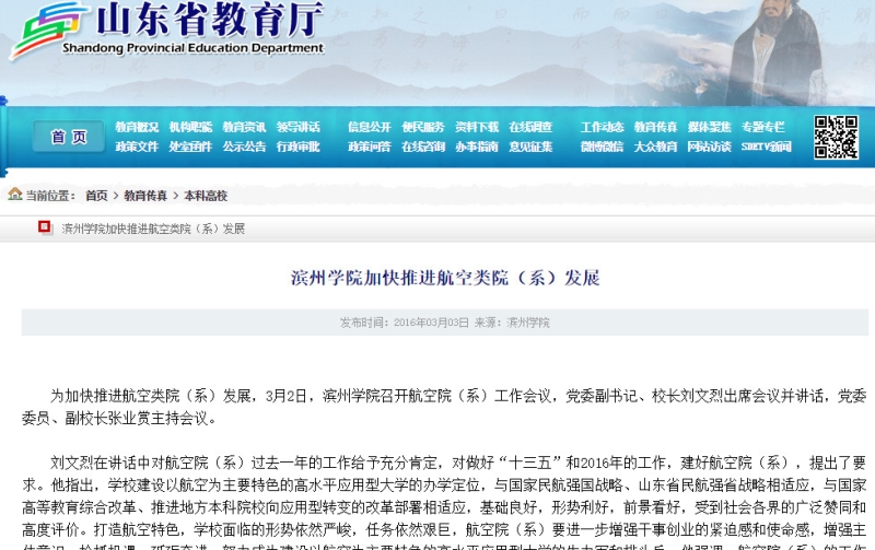 [山东省教育厅官网]滨州学院加快推进航空类院(系)发展