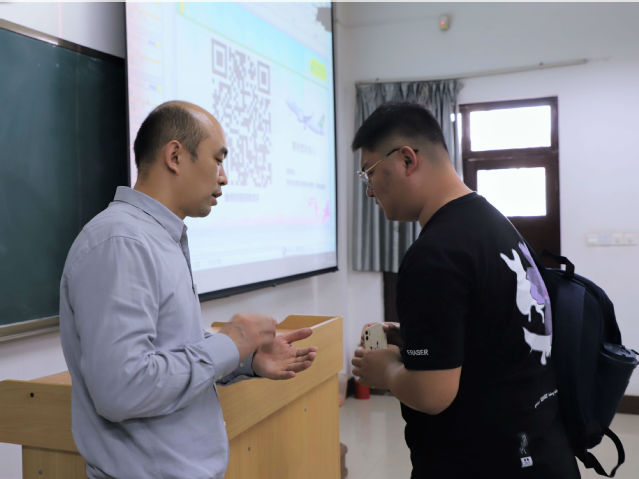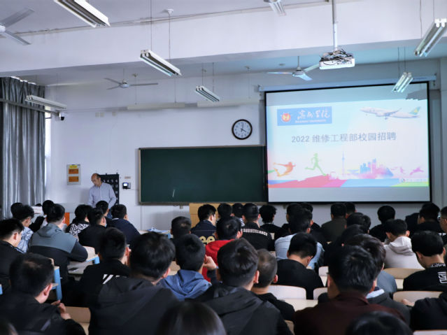 李帅致辞,表达对春秋航空股份有限公司到来的欢迎和进一步加强合作的殷切期盼。此次招聘会面向2022届毕业生,招聘岗位以航空维修工程师学员为主。张军平从公司信息、公司发展、个人发展等方面进行概述,围绕责任荣誉、科学规范、严谨笃行、高效和谐、创新起源的机务理念进行详细讲解。详细介绍了公司对于学员的培训方案和要求。现场同学积极互动,提问相关专业问题,张军平为其一一解答。