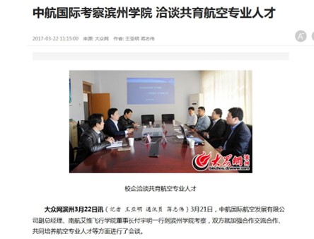 [《大众网》] 中航国际考察滨州学院 洽谈共育航空专业人才