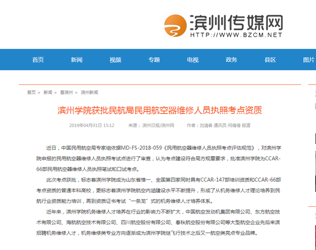 [滨州传媒网] 滨州学院获批民航局民用航空器维修人员执照考点资质