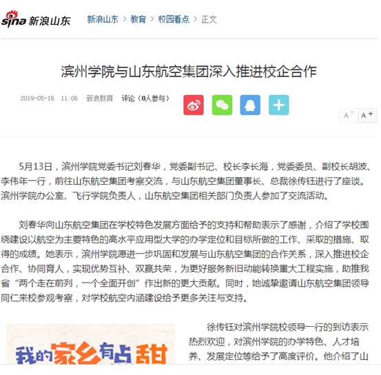 [新浪山东] 滨州学院与山东航空集团深入推进校企合作