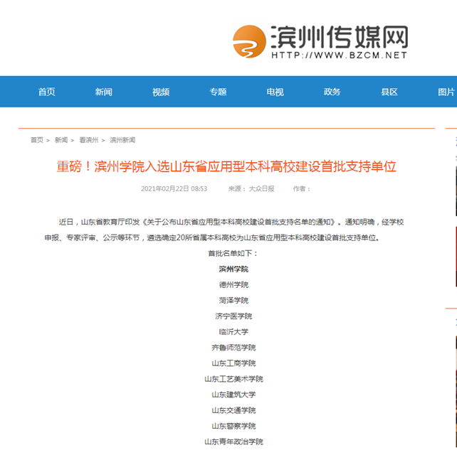 [滨州传媒网] 重磅!滨州学院入选山东省应用型本科高校建设首批支持单位