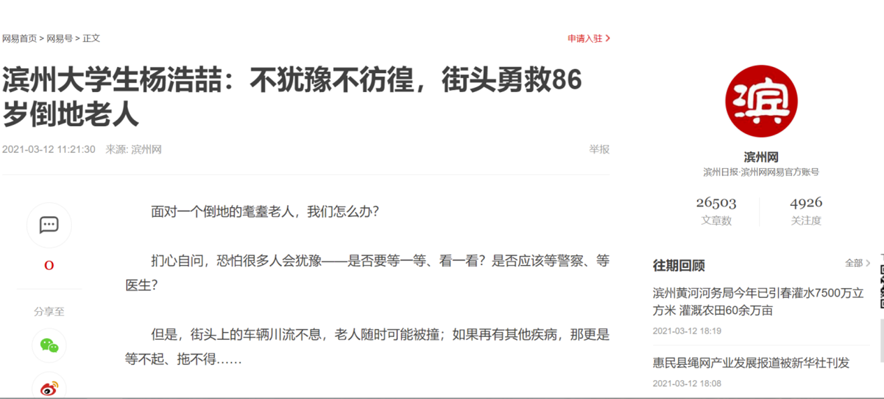 [网易·滨州网] 滨州大学生杨浩喆:不犹豫不彷徨,街头勇救86岁倒地老人