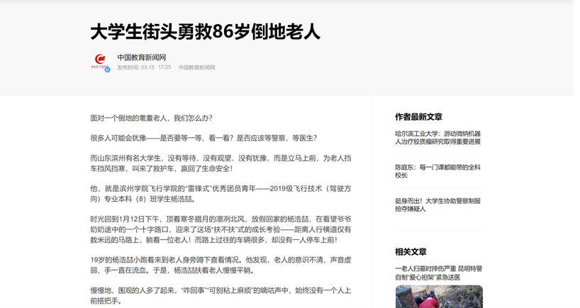 [中国教育新闻网] 大学生街头勇救86岁倒地老人