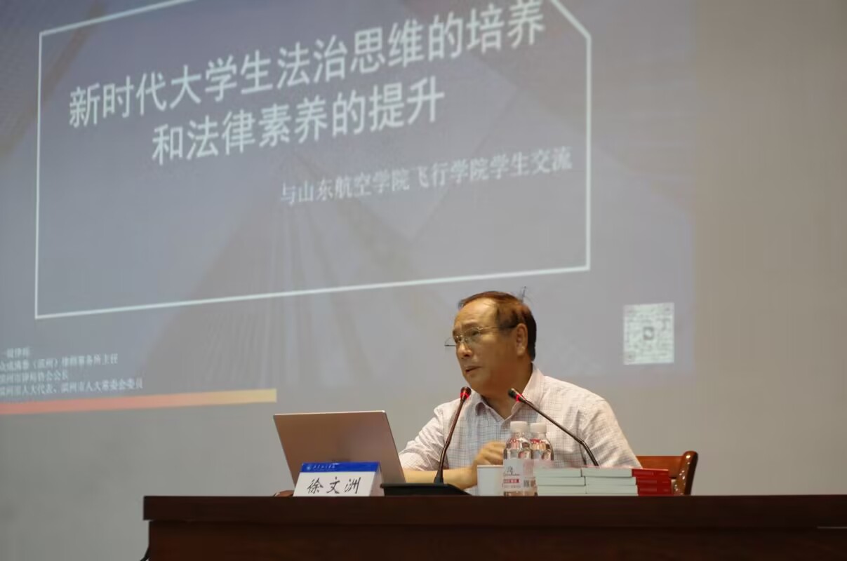 7196月6日,飞行学院邀请我校原政治系1980级优秀校友、国家一级律师、山东省优秀律师、山东省律师行业优秀党员律师、滨州市人大代表、滨州市人大常委会委员、滨州市律师协会会长、山东众成清泰(滨州)律师事务所徐文洲主任,围绕“新时代大学生法治思维培养和法律素养提升”主题,旨在提升学生法治思维与能力,掌握基本的法治原理和基本方法,具备良好的法治意识和处理法律事务的能力。