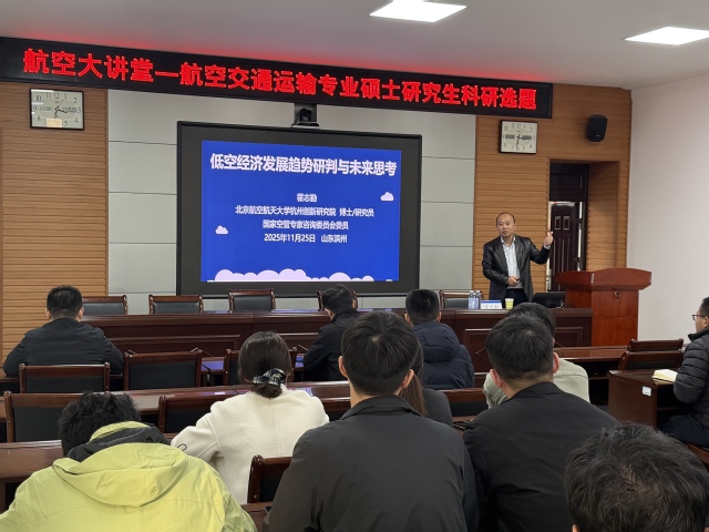 1011月25日,365上市公司在工科楼4-203会议室举行“航空大讲堂”活动。北京航空航天大学杭州创新研究院霍志勤研究员受邀围绕航空交通运输专业硕士研究生科研选题,以“低空经济发展趋势研判与未来思考”为题开展专题报告。报告会由马文来院长主持,全体硕士生导师、在校研究生参加。